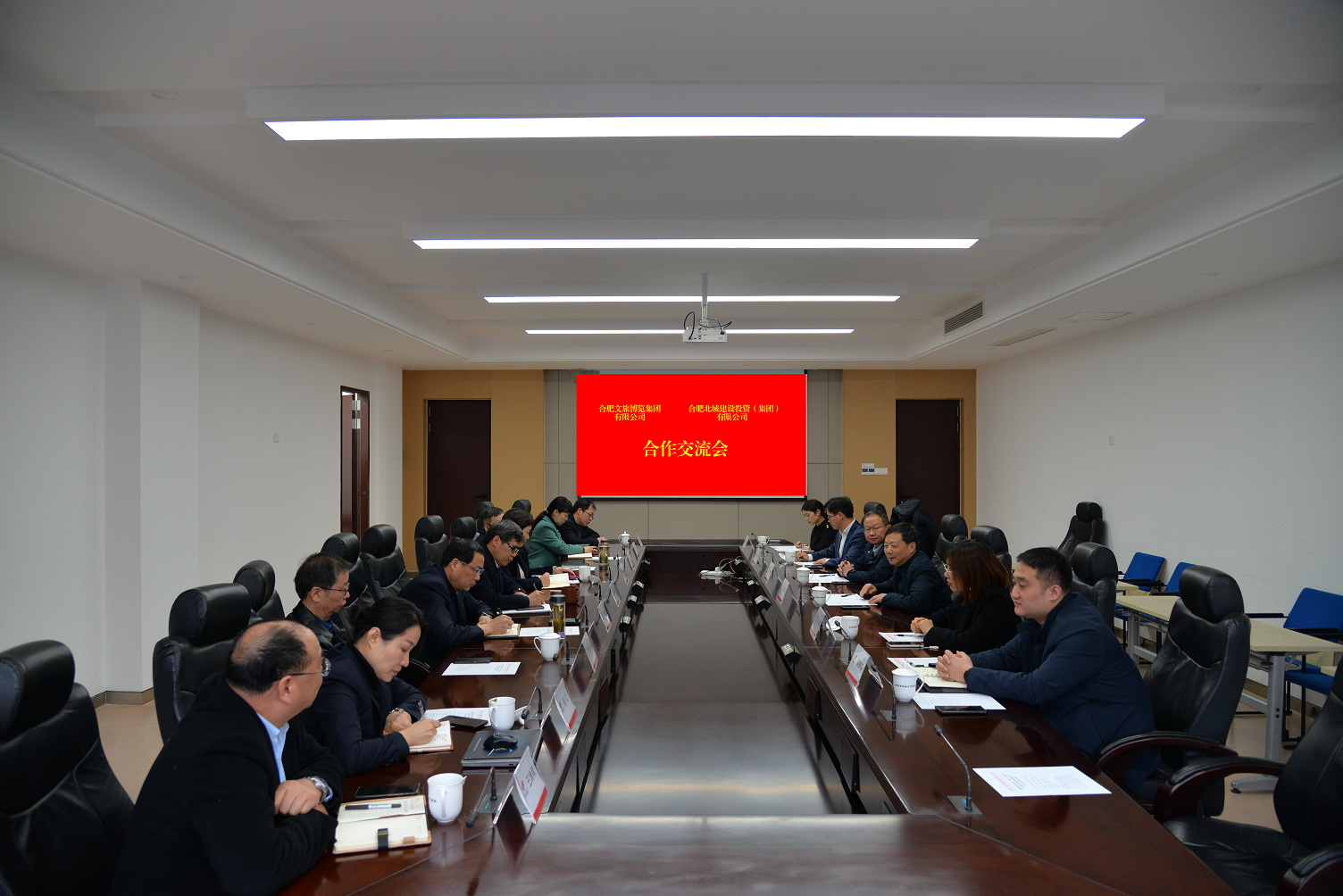 会上,陈杰董事长首先对周庆旗董事长一行的到来表示诚挚地欢迎,他表示,文旅博览集团转型发展高端现代服务业以来,坚持以市场为导向、资本为纽带、整合为手段、创新为动力,积极发挥集团作为全市“高端服务业投融资平台、国有资本运营平台和重大服务保障平台”的战略作用。同时加强与县市区合作,利用地方产业平台投资开发文旅产业,积极响应和落实省市关于打造合肥国际知名旅游城市的奋斗目标。相关负责人分别就业务经营和项目建设情况进行介绍。周庆旗董事长一行表示,合肥文旅博览集团作为市属平台,旗下两大会展中心和体育中心规模大、设施完善、相关配套服务齐全,场馆运营管理模式值得学习和借鉴。