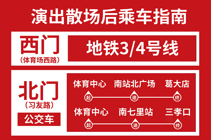 散场大巴路线:为保障观演朋友们快速有序、安全退场,本场演出结束后会在合肥体育中心西门/北门共安排50辆公交车用于疏散服务。