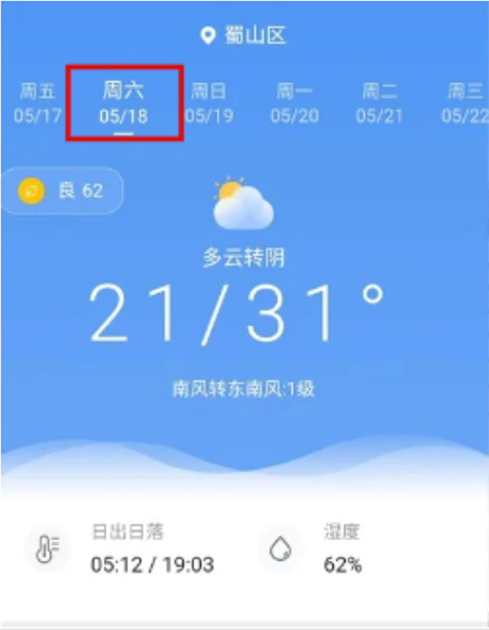 根据气象台发布的天气预报显示,5月18日为多云转阴,最高气温31摄氏度,您可按个人习惯增减衣物,请注意防暑。