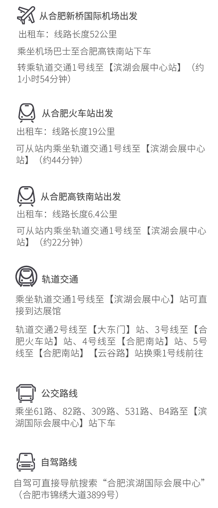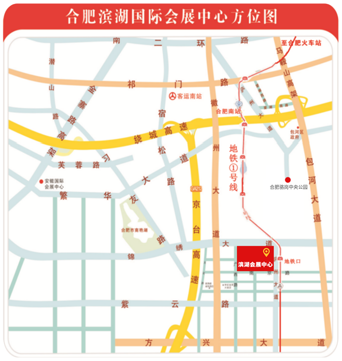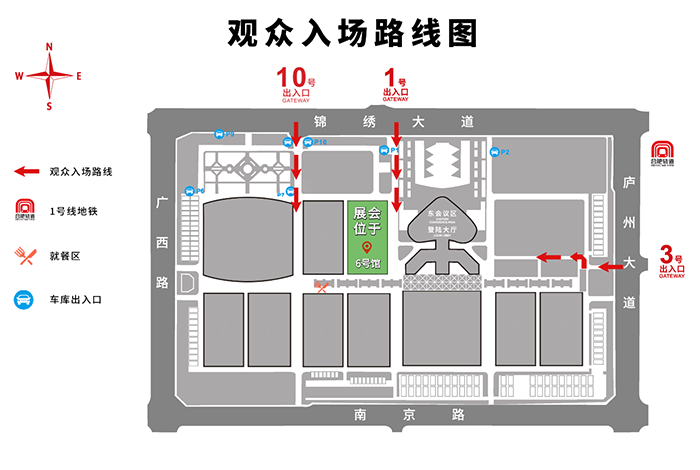 1. 观众请由上图所示锦绣大道10号、1号道口,庐州大道3号道口进出参观。