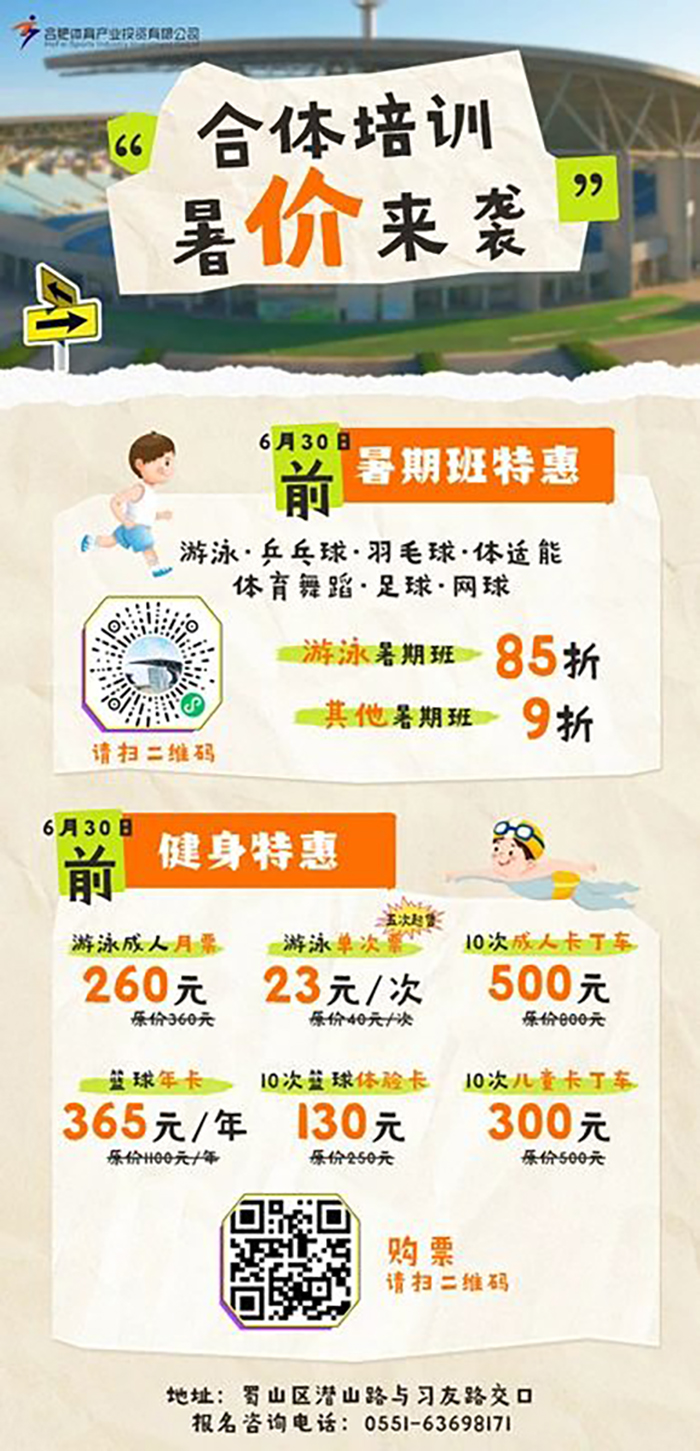 暑假来袭,合体培训暑期班项目多多,特惠多多。游泳、羽毛球、乒乓球、足球、网球、体育舞蹈、体适能项目全面火热招生中,进入合肥体育中心小助手小程序即可报名,6月30日前最低可享85折优惠。