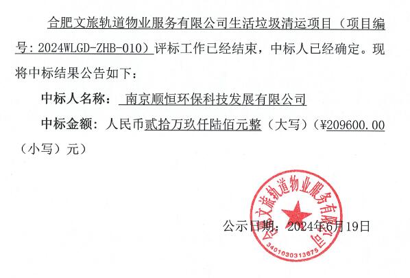 合肥文旅轨道物业服务有限公司生活垃圾清运项目中标结果公告