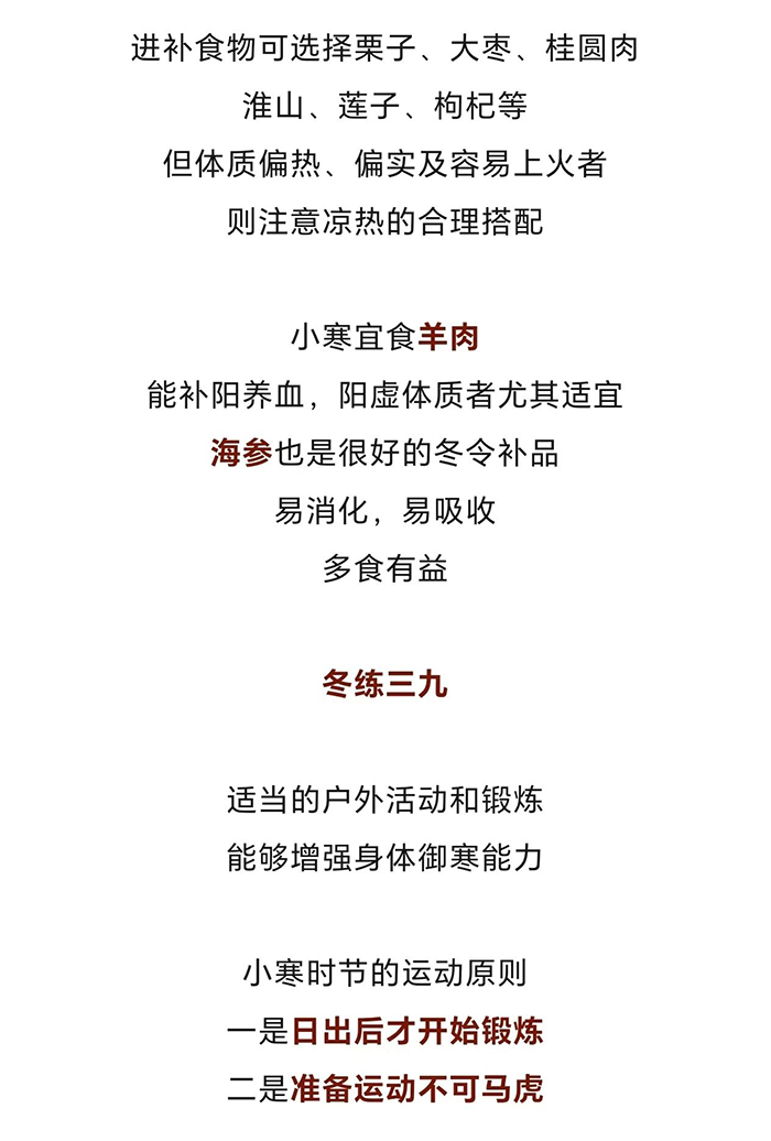 传统中医认为,寒为阴邪此时是一年中阴邪最旺的时期因而小寒的养生原则是“敛藏精气、固本扶元”