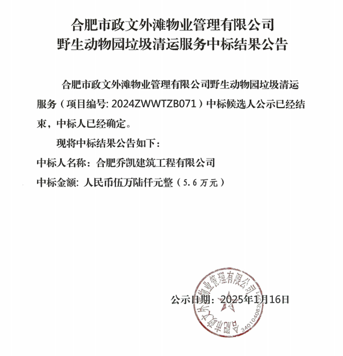 合肥市政文外滩物业管理有限公司野生动物园垃圾清运服务中标结果公告