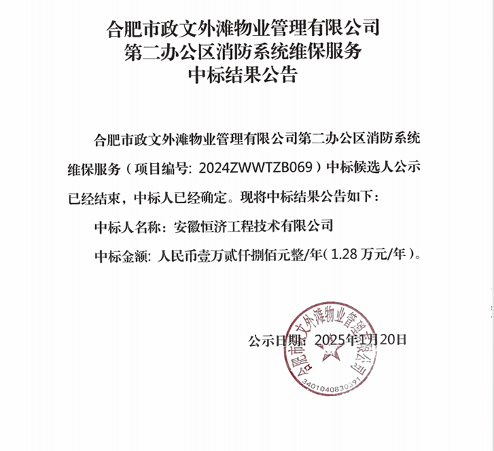 合肥市政文外滩物业管理有限公司第二办公区消防系统维保服务中标结果公告